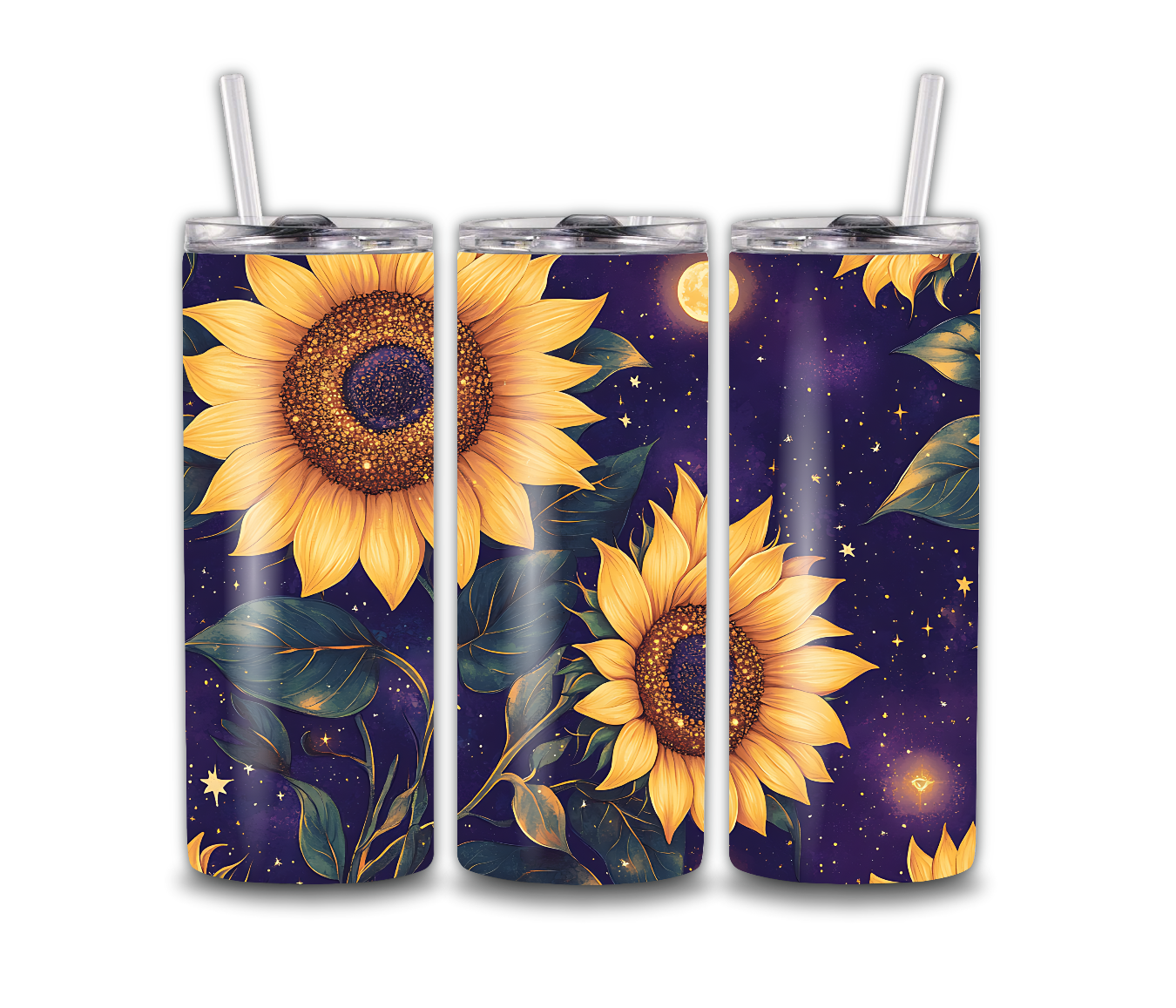 Yelllow Sunflowers with Green Leaves, Dark Blue Background